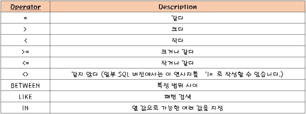 - SQL은 텍스트 값을 작은따옴표로 묶어야 합니다.(대부분의 데이터베이스 시스템에서는 큰따옴표도 허용합니다.)