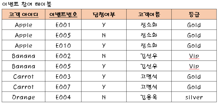 - 그런데 이 투플은 orange 고객의 이벤트 참여에 대한 정보뿐만 아니라, 해당 고객에 대한 정보도 유일하게 가지고 있다.
