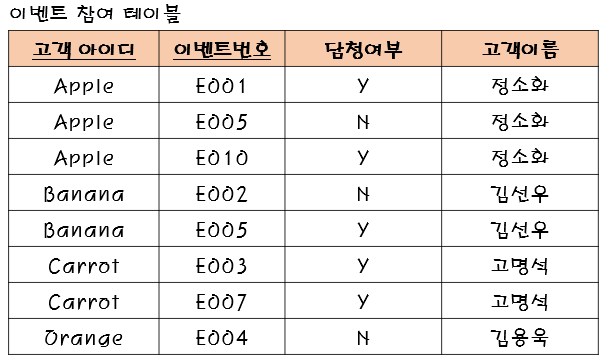 - e.g) 이벤트 참여 테이블에서 고객이름은 고객아이디에 완전 함수 종속되어 있다. (고객아이디(