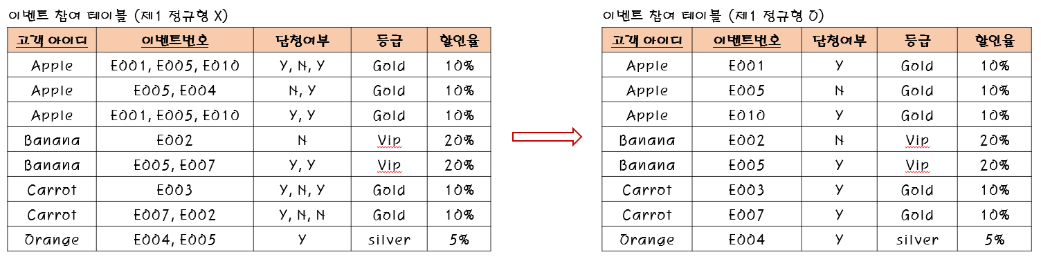 - 다음의 그림은 제1 정규형에 속하는 이벤트 참여 테이블을 만드는 과정이다.