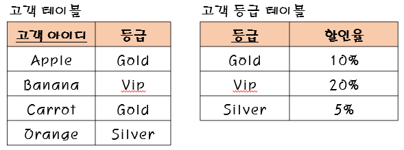 - 위에서 분리된 고객 테이블은 고객아이디가 기본키이므로 등급과 할인율 속성이 고객아이디에 함수적으로 종속된다.