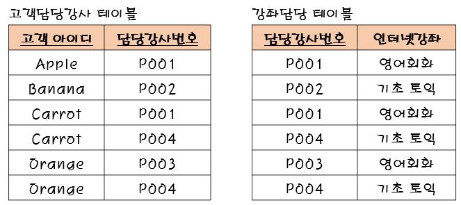 - 아래 그림의 신청강좌 테이블은 고객이 인터넷강좌를 신청하면 해당 강좌의 담당강사에 대한 데이터를 저장한다.